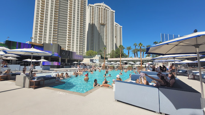 The lush palm trees, comfortable poolside deck chairs, and overall ambience capture the luxurious essence of a Las Vegas pool party. Wet Republic’s extensive bar offers a variety of ice-cold refreshments to help you beat the desert heat. The cabanas are luxuriously furnished and equipped with cutting-edge technology, including large LED TVs and Blu-ray players for entertainment. For a more exclusive experience, you can rent a bungalow exclusively for your group.